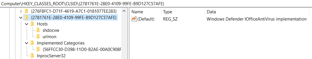 以下のスクリーンショットのように HKEY_LOCAL_MACHINE\SOFTWARE\Classes\CLSID\{2781761E-28E0-4109-99FE-B9D127C57AFE} のレジストリキーが登録されていることを確認でき、ここから Microsoft Defender のコンポーネントに関する情報を参照できることがわかります。