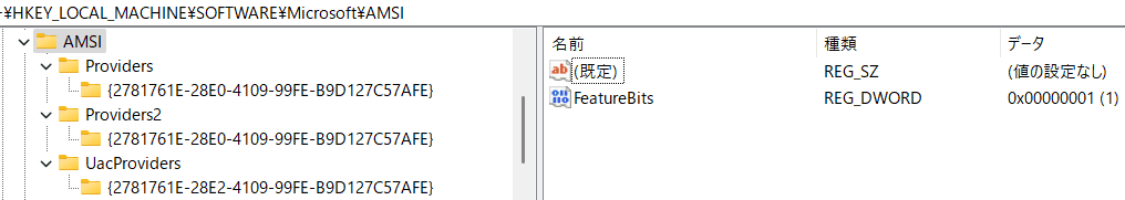 既定では、HKEY_LOCAL_MACHINE\SOFTWARE\Microsoft\AMSI\Providers 直下に AMSI プロバイダーの ID である {2781761E-28E0-4109-99FE-B9D127C57AFE} が登録されていることを確認できます。