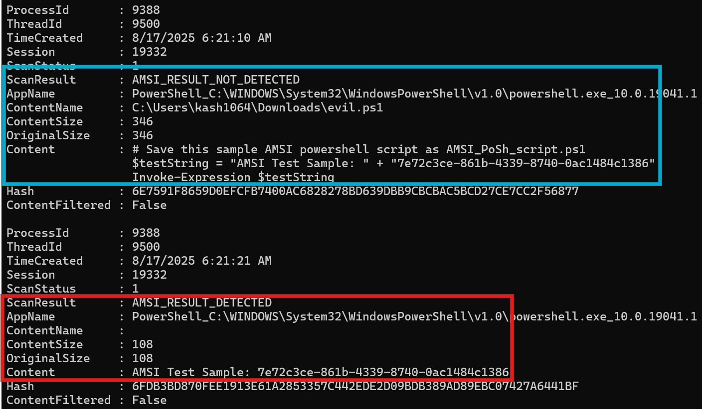 また、このテスト用スクリプトがブロックされる際に取得した ETW トレースを Get-AMSIEvent "$($env:USERPROFILE)\Downloads\AMSITrace.etl" コマンドで解析してみると、以下のようにスクリプト全体が評価された際には検知が発生しなかった(AMSI_RESULT_NOT_DETECTED)ものの、その後に $testString として連結された文字列 AMSI Test Sample: 7e72c3ce-861b-4339-8740-0ac1484c1386 が評価された際には、AMSI による検知が行われた(AMSI_RESULT_DETECTED)ことを確認できます。