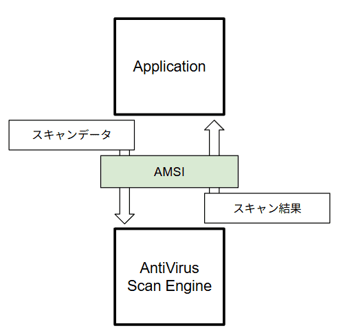 AMSI は、このイメージ図のように各アプリケーション側から AMSI を通して システム内で稼働するアンチマルウェア製品にスキャン対象のデータを連携し、そのスキャン結果を受け取ります。