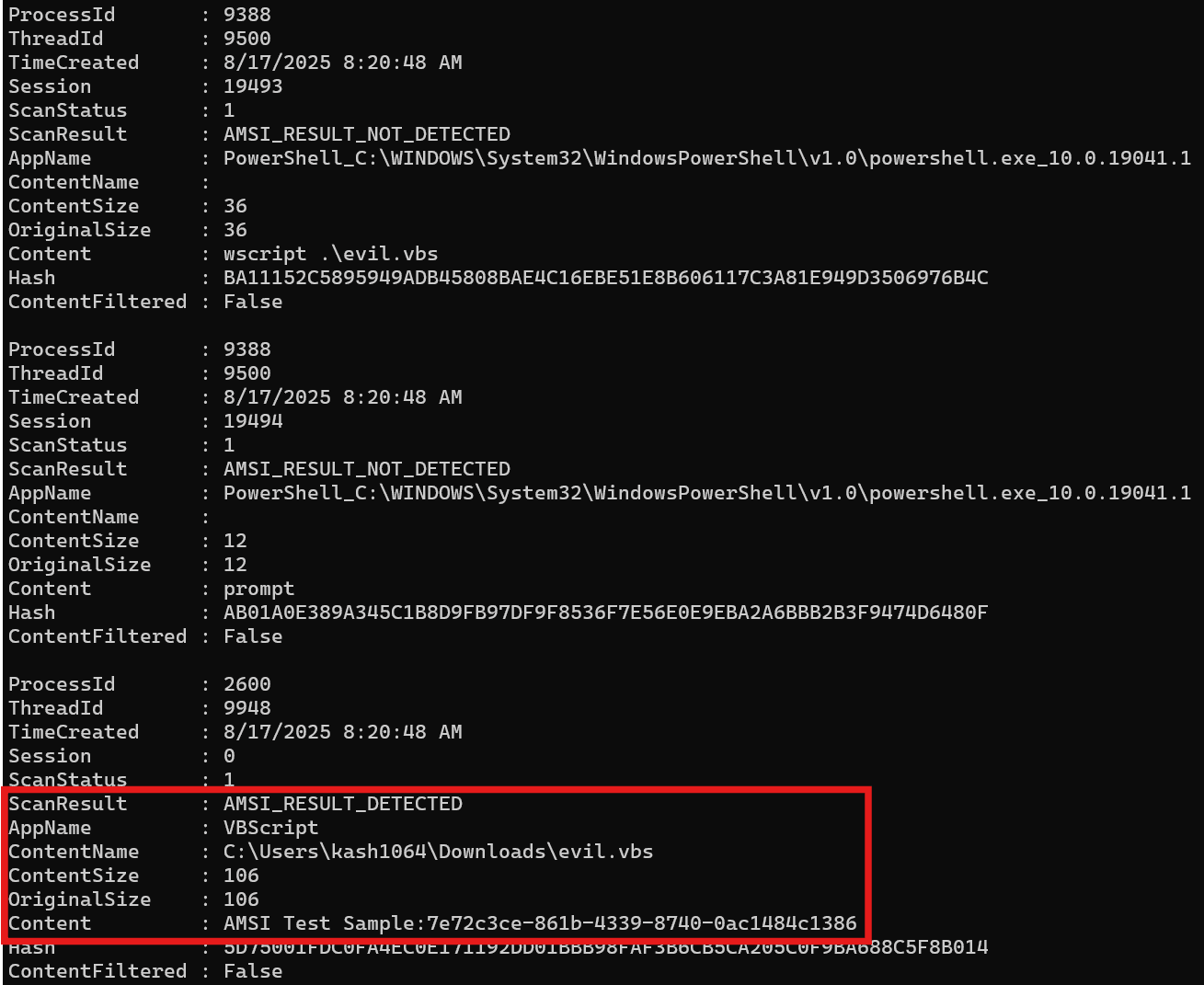 また、この時取得した ETW イベントトレースを解析してみると、 PowerShell の場合と同じく検知用のテスト文字列が評価されたタイミングで AMSI による検知が発生したことを確認できます。