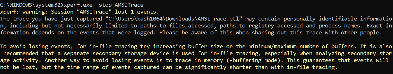 xperf.exe -stop AMSITraceXperf を使用すると、ETW イベントのロストが発生した場合は、