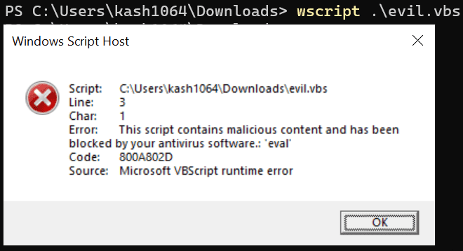 WScript.Echo resultこのスクリプトを evil.vbs として保存して実行すると、以下のようなエラーウィンドウが表示され、スクリプトの実行がブロックされたことを確認できます。