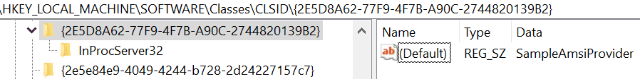 COM サーバーとして登録されている SampleAmsiProvider の CLSID と DLL へのパスが書き込まれたことを確認できます。