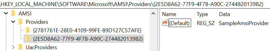 regsvr32 AmsiProvider.dllこのコマンドにより、HKEY_LOCAL_MACHINE\SOFTWARE\Microsoft\AMSI\Providers の直下に新しく SampleAmsiProvider の ID である {2E5D8A62-77F9-4F7B-A90C-2744820139B2} が登録されました。