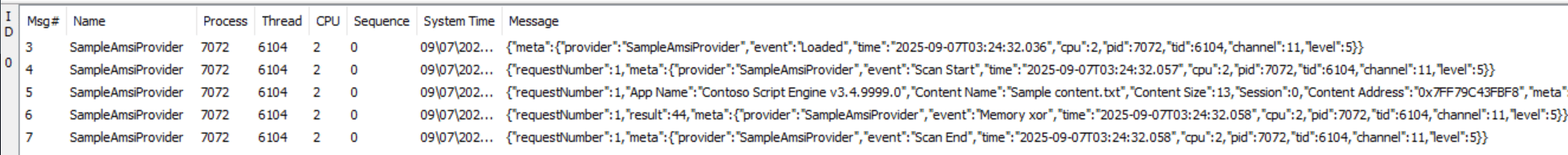 その結果、SampleAmsiProvider による複数のイベント出力が行われることを、Trace View の GUI 上で確認することができます。