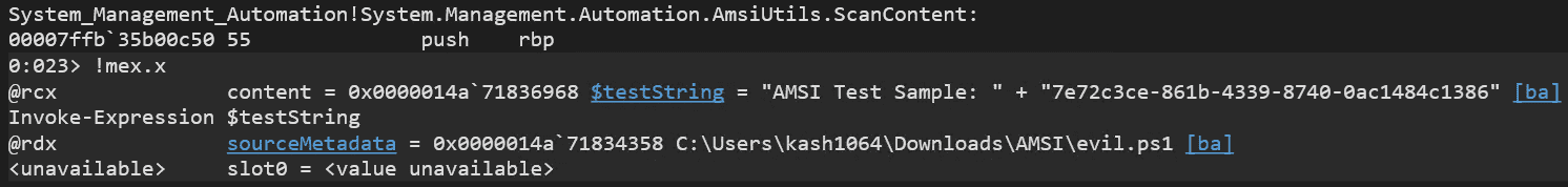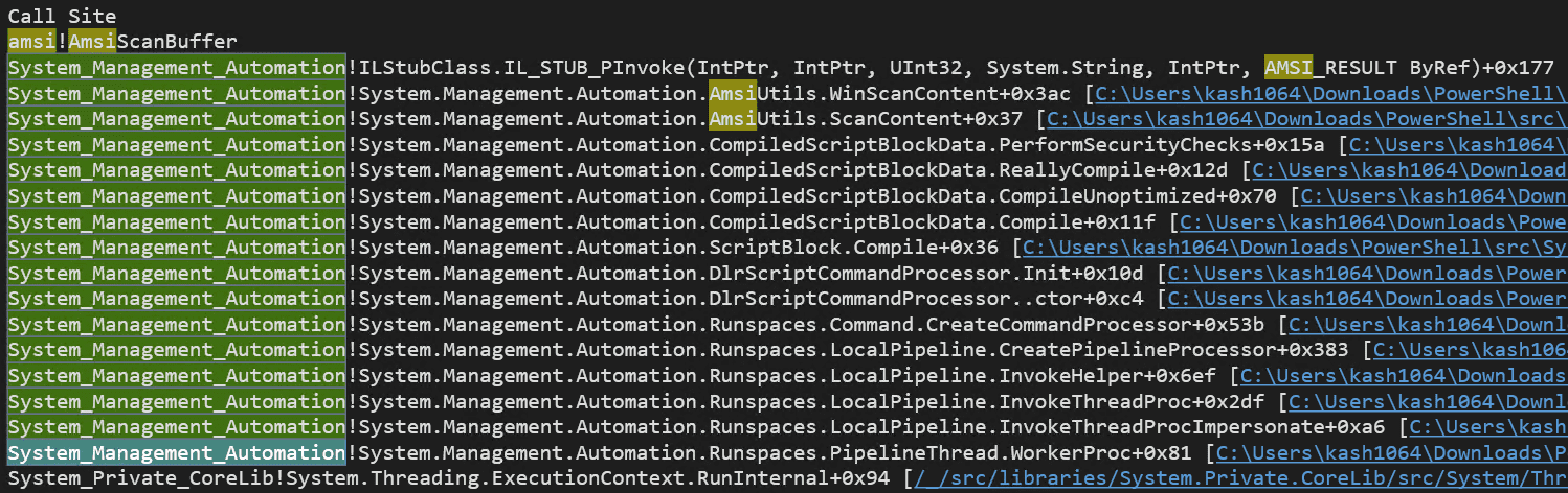 このコールスタックを見ると、System.Management.Automation.dll で実装されている AmsiUtils.ScanContent メソッドがさらに AmsiUtils.WinScanContent メソッドを呼び出し、 最終的に Win32 API レイヤーの AmsiScanBuffer 関数の実行に繋がっていることがわかります。