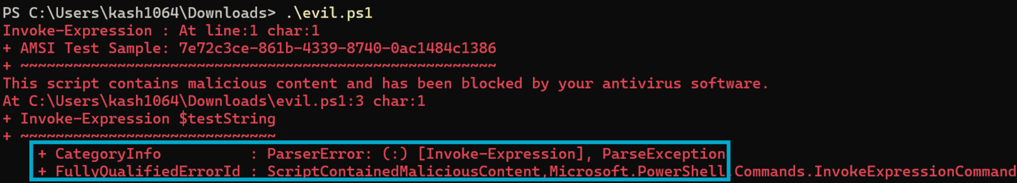 こうして、AMSI によって不正な PowerShell スクリプトの実行がブロックされ、 以下のようなエラー画面が表示されることになります。