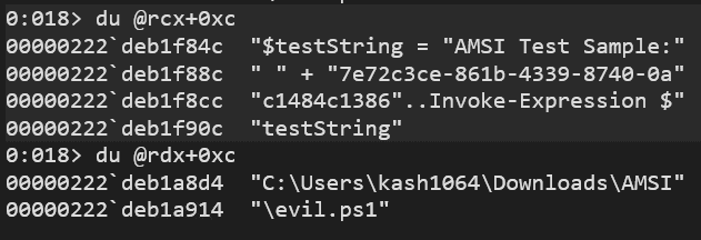 WinDbg を使用して amsi!AmsiScanBuffer にブレークポイントをセットした後に、