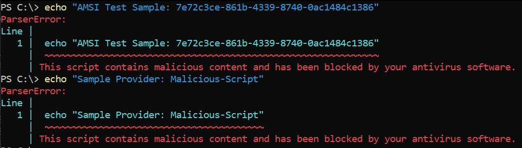 4 章で実装したサンプルプロバイダー用の検知テスト文字列 Sample Provider: Malicious-Script がどちらも AMSI により検知されることを確認できます。