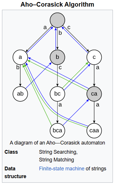そこで、Trie 木の構造をベースに Aho-Corasick 法による検索を行うための有限オートマトンを作成します。
