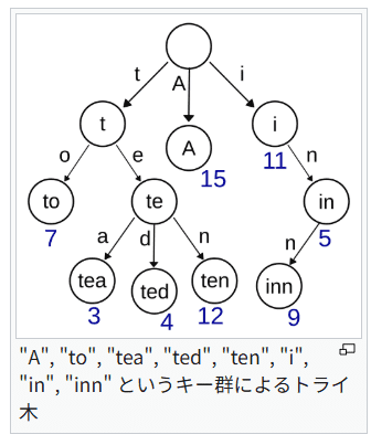 上記の例では、「“A”, “to”, “tea”, “ted”, “ten”, “i”, “in”, “inn”」というキーワードの集合を Trie 木で表現しており、最初のノードにはユニークな prefix を抜き出した「“t”, “A”, “i”」が入っています。
