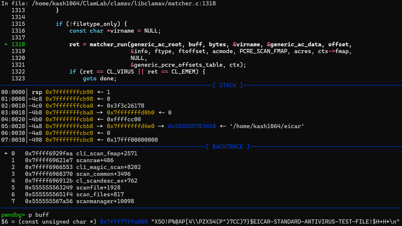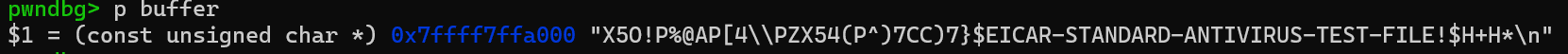 cli_ctx *ctx)この関数の呼び出し時に与えられる buffer には、Eicar テキストのようにスキャン対象のデータが割り当てられています。