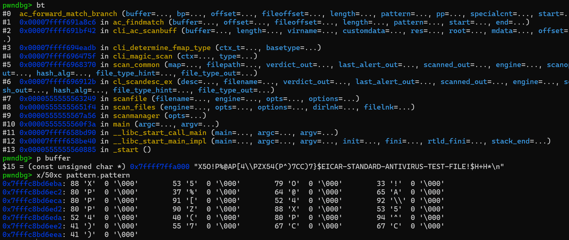 実際に Eicar スキャン時のデバッグをしてみると、このタイミングで pattern->pattern のシグネチャパターンとスキャンデータである buffer が 1 バイトずつ比較されていることを確認できます。